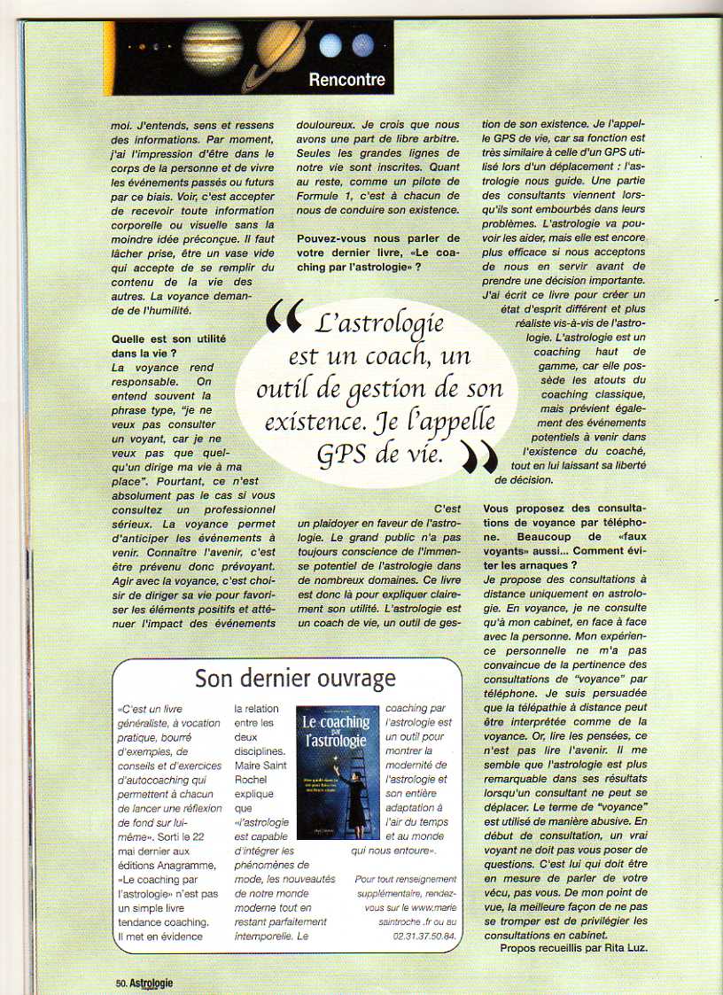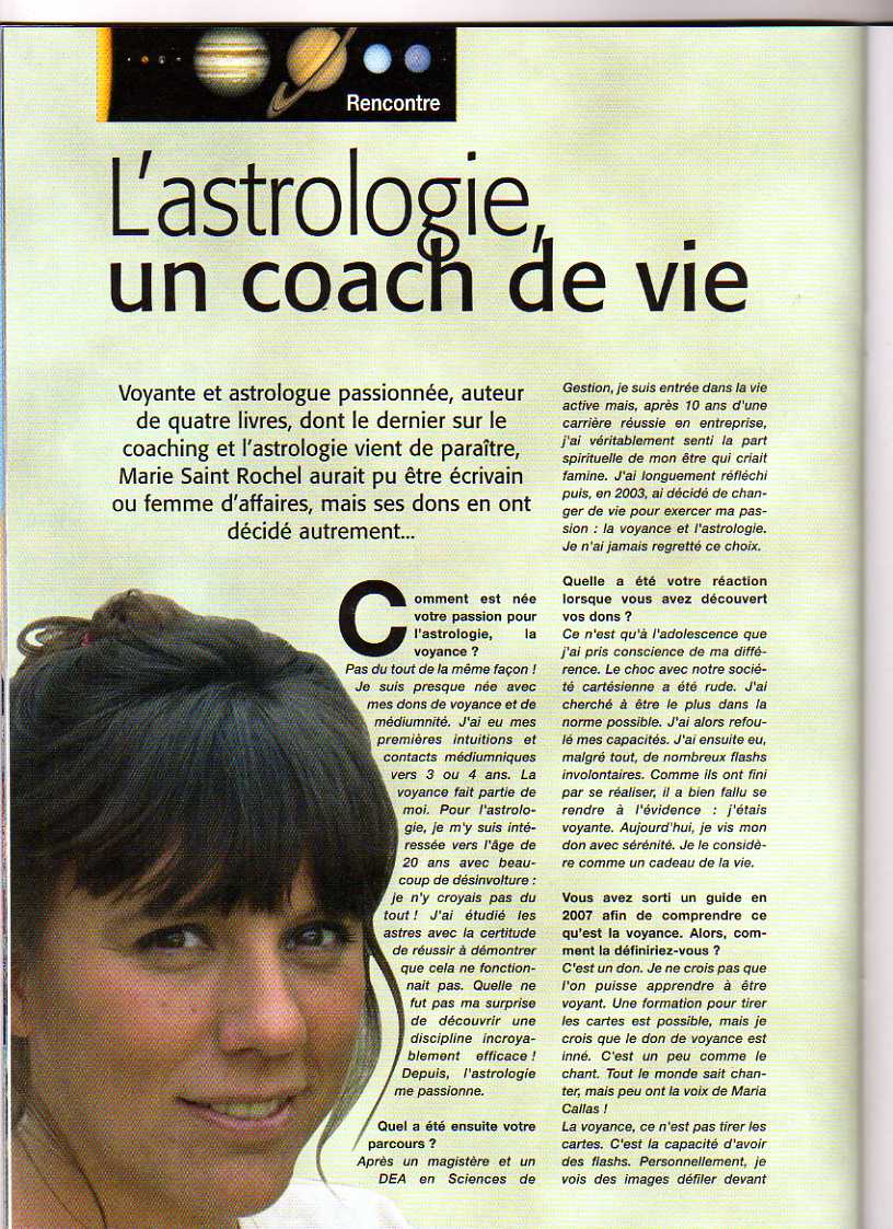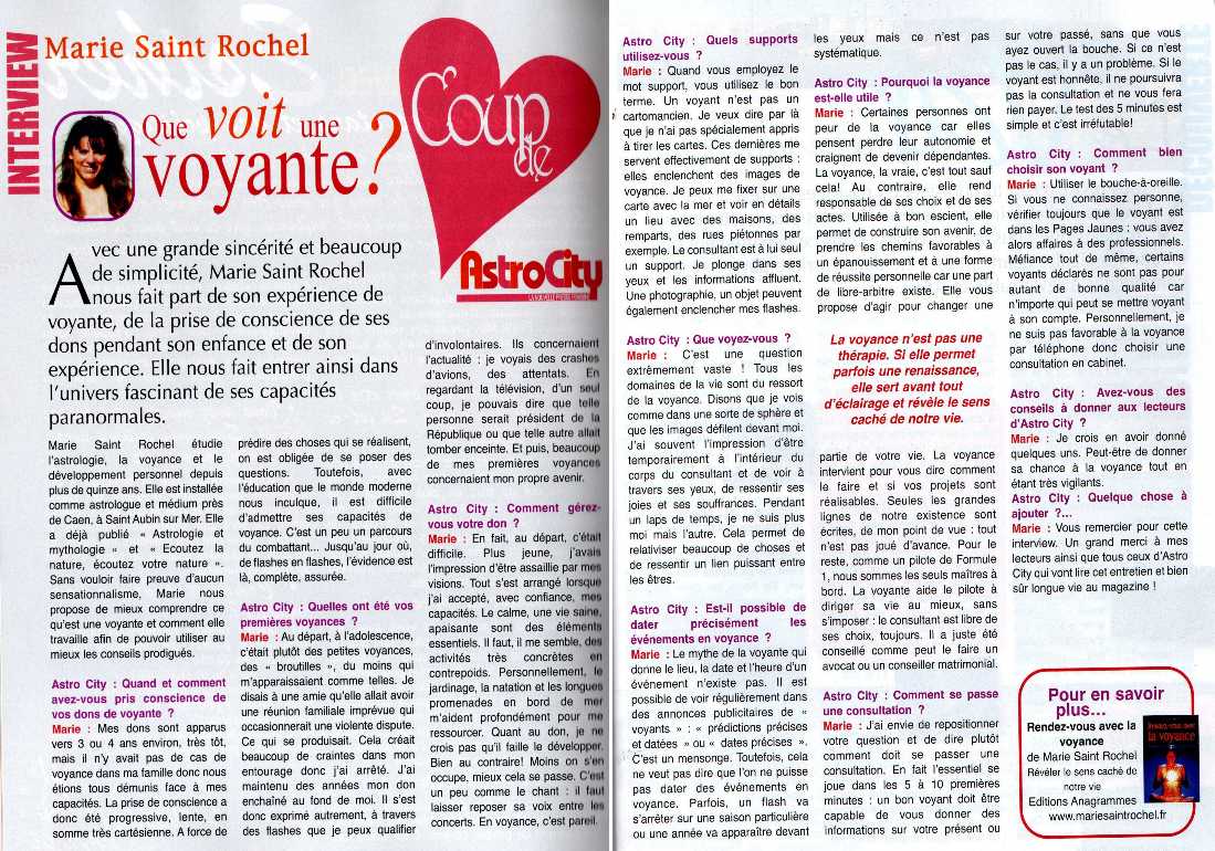 Marie a été interviewée et a écrit des articles à de nombreuses reprises dans la presse écrite nationale : BIBA, MAXI, France Soir, Horoscope Magazine, NostraVoyance, SoyonsZen, Astrologie Magazine, Astrologos, AstroCity
