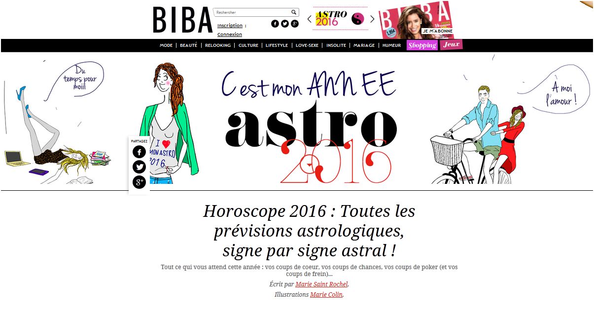 Marie a réalisé pendant 9 ans les horoscopes de l’été et les grands horoscopes annuels du magazine féminin BIBA (plus de 400 000 exemplaires vendus à chaque magazine) en version papier et sur le site web du magazine
